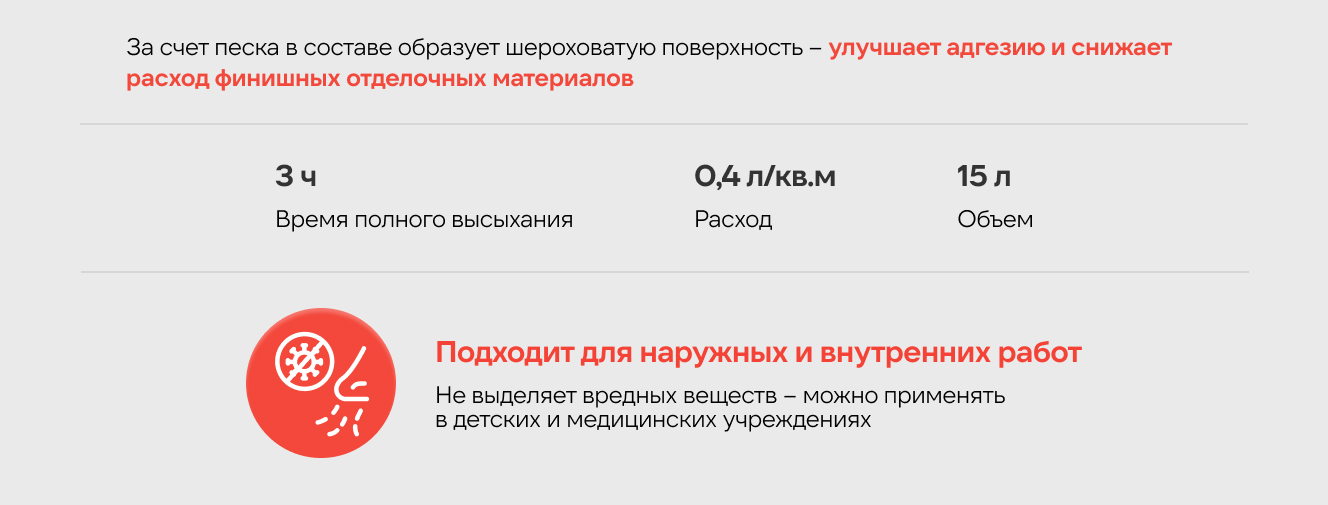 За счет песка в составе улучшает сцепление с последующими покрытиями