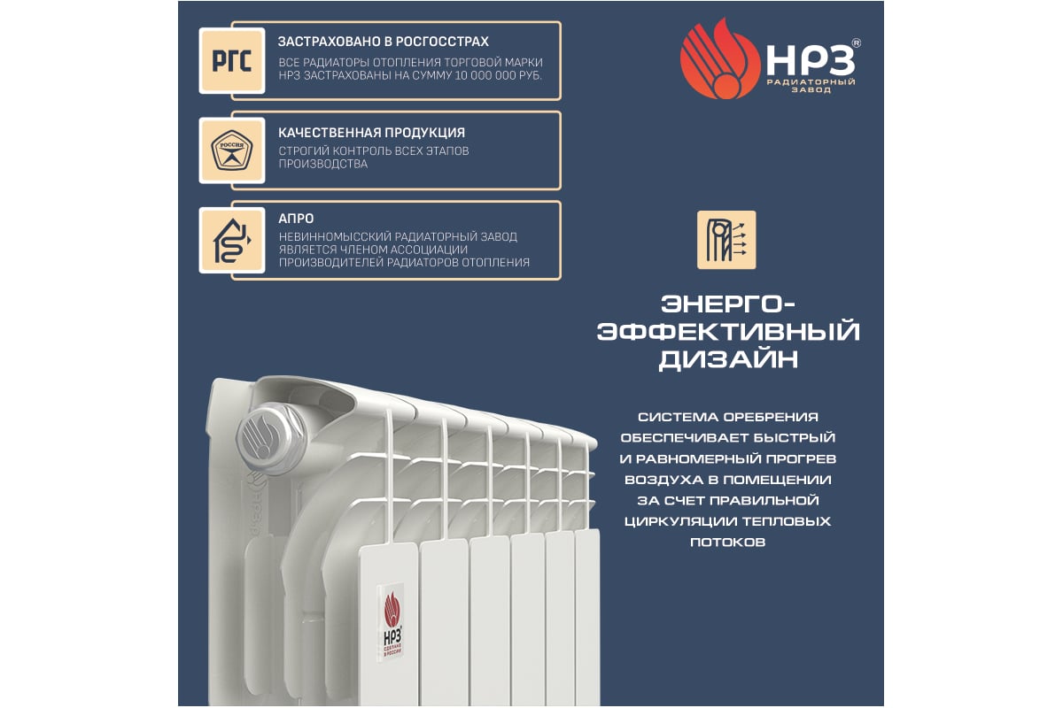 Биметаллический радиатор НРЗ содержит стальной закладной элемент - вертикальный коллектор и горизонтальные, которые формируются вместе с корпусом из алюминиевого сплава в процессе литья под давлением. Рекомендован к установке в квартире. При сниженном потреблении тепловой энергии (теплоносителя) обеспечивает быстрый прогрев воздуха.