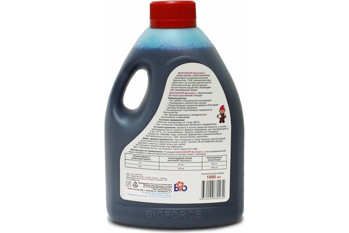 Биопрепарат для нижнего бачка Biotoilet L 1000 мл биотуалетов BIOFORCE bl-033 заливается в приемный резервуар биотуалетов, для ускоренного разложения отходов.