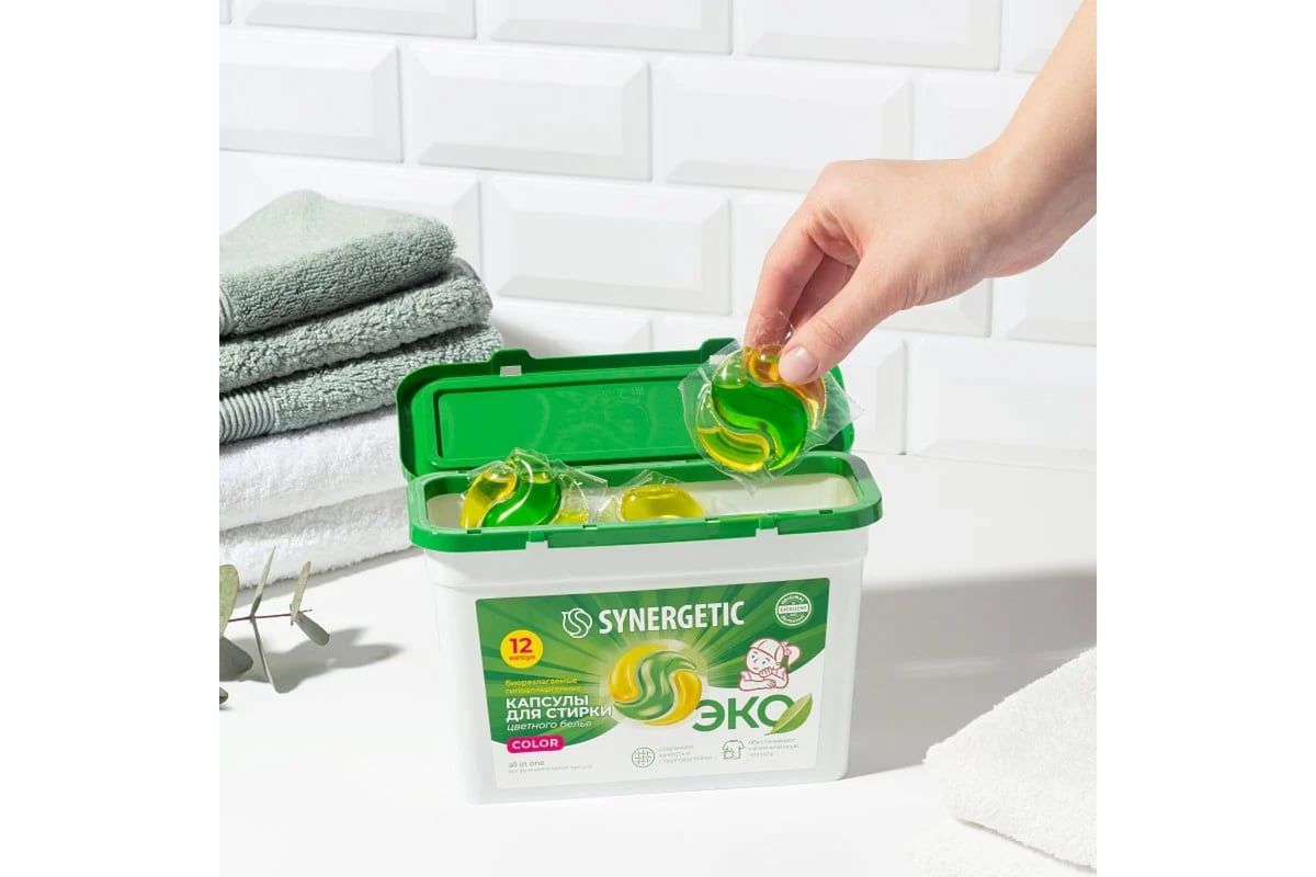 Биоразлагаемые капсулы для стирки цветного белья SYNERGETIC COLOR обеспечивают гигиеническую чистоту, проникая глубоко в волокна ткани и расщепляя самые сложные загрязнения. Препятствуют появлению катышков и ворсинок, а также устраняют неприятные запахи.