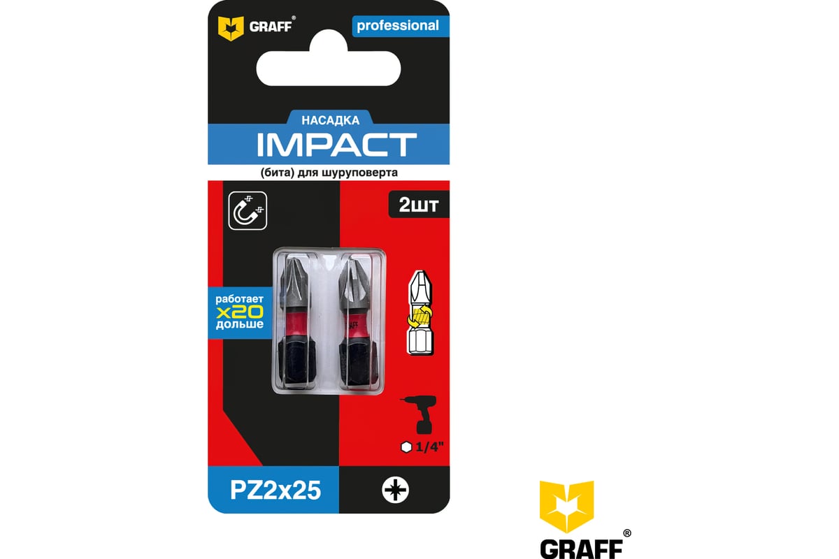 Биты GRAFF серии IMPACT PZ 2x25 мм специально разработаны для тяжелых условий, особенно при работе с импульсными шуруповертами и гайковертами. Уникальная форма насадки значительно увеличивает ее производительность за счет преодоления пиковых вибраций инструмента и компенсации ударной нагрузки.