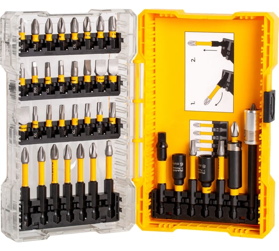 Этот набор является представителем профессионального класса. Набор торсионных бит в наборе предназначен для работы с разными видами крепежа. Намагниченные торсионные биты выполнены из высокопрочной легированной стали S2, что обеспечивает повышенную износостойкость и увеличивает срок службы. Торсионная зона позволяет работать ударным шуруповертом. Торсионный тип очень хорошо справляется с тангенциальным ударом (удар по касательной) при вращении. Магнитный наконечник бит удерживает крепеж, что обеспечивает удобство при работе.