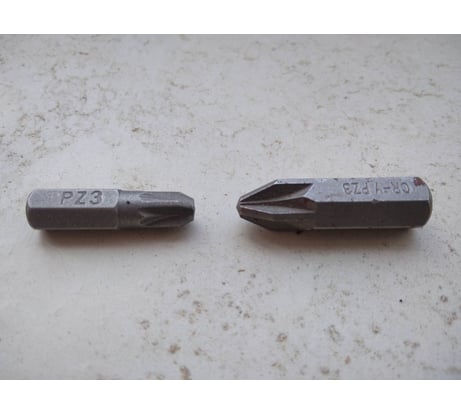 Приятно удивлен (возможно удачная партия). Купил две упаковки по акционной цене 0.90руб за одну биту - полагал, на пару дней хватит. Обычно изделия такой ценовой категории предназначены только для ручного труда, в шуруповерте либо немедленно зализываются, либо рассыпаются, и по большому счету являются выгодным разовым расходником. По факту вес в среднем 5.15гр (обычно для этого размера вес характерно порядка 5.45г), толщина лопастей пропеллера (граней) около 1.20мм (обычно PZ3 около 1.40мм), скос наконечника почти отсутствует (острие плоское, выглядит ровно так, если взять стандартную биту и спилить наконечник на 1мм), на некоторых экземплярах есть производственный дефект граней (какбы всесторонняя симметричная поклоцанность при радиальной обработке). Отработал в аккумуляторном перфораторе (без ограничителя момента) больше сотни шурупов 6Х90 на вывинчивание с зарывшимися в древесину шляпками и полсотни закрутил - НЕ РАССЫПАЛАСЬ (дайте мне поставить этому экземпляру оценку из шести звезд) ! Намагничиваются на раз-два мощным магнитом. Плюс небольшой бонус из недостатка - тонкие лопасти позволяют за минуту подточить биту и использовать как PZ2.