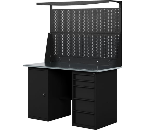 Верстак-стол GREENBERG BLACK с перфопанелью двойной с тумбой и ящиками 1400мм VERSTAK_BLACK_ТY_Р2_1400