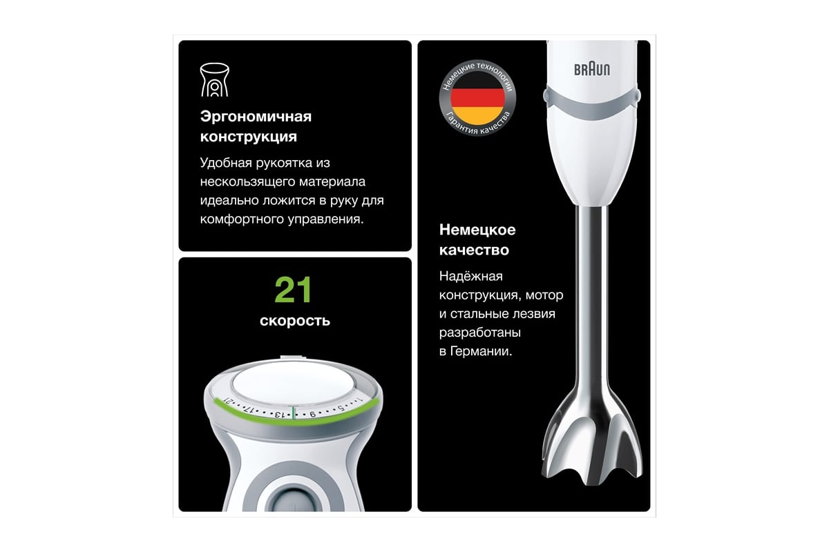 Погружной блендер Multiquick 5 Vario имеет 21 скорость, которую легко регулировать одним движением. Мощный двигатель 1000 Вт легко и быстро справится с различными продуктами. Запатентованная система EasyClick позволяет легко менять насадки в один клик. В комплект блендера Braun Multiquick 5 Vario MQ5245WH входит: насадка измельчитель 300 мл, насадка-кувшин 1250 мл. с ножом для колки льда, венчик, мерный стакан со шкалой объемом 600 мл.