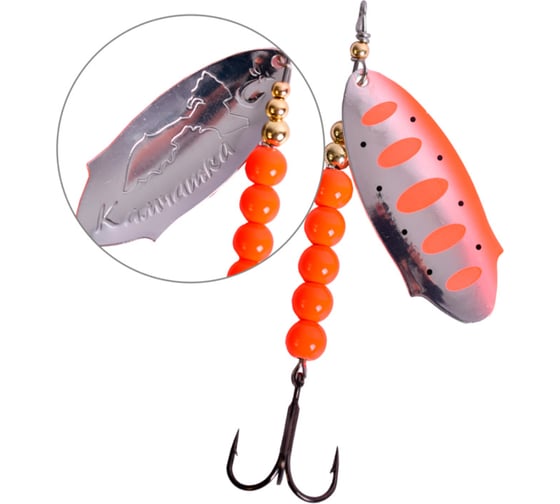Вращающаяся блесна «Камчатка» имеет весьма крупные габариты, её вес – 23 грамма при длине лепестка 52 мм. Лепесток имеет вытянутую форму и небольшой угол отклонения – около 30 градусов. Такая компоновка блесны обеспечивает хорошую игру приманки на сильном течении. Сердечник выполнен в виде шариков, окрашенных в яркие флуоресцентные цвета, что хорошо имитирует икру лососевых рыб. В первую очередь «Камчатка» предназначена для ловли крупных лососевых рыб – кижуча, чавычи, симы, тайменя и сёмги. Но она так же может с успехом применяться при ловле сома и щуки в реках и озёрах средней полосы России.