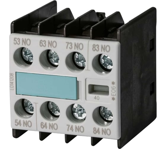 Блок дополнительных контактов с 4 НО (нормально открытых) контактами предназначен для использования с вспомогательными реле и контакторами коммутации электродвигателей типоразмера S00. Он соответствует стандарту DIN EN50005 и оборудован винтовыми клеммами для удобного монтажа и подключения.