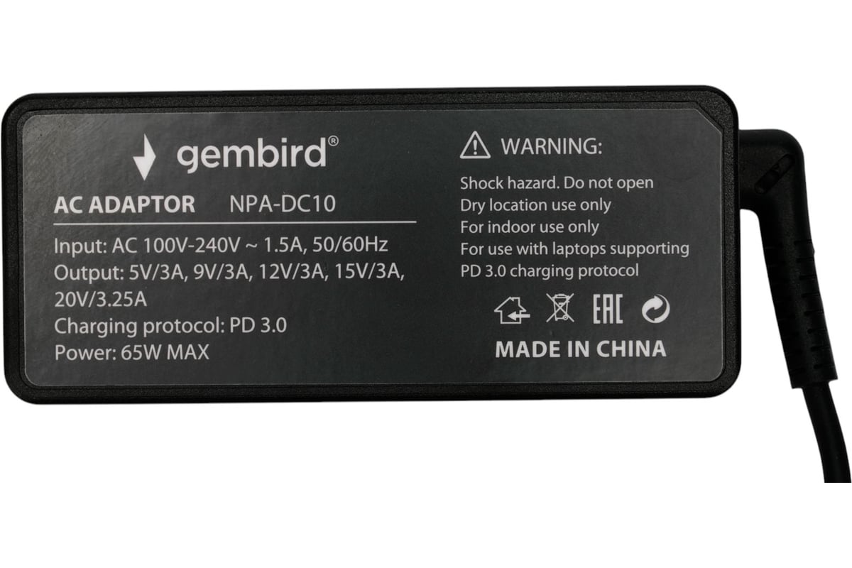 Блок питания для ноутбуков Gembird PD3.0, 65Вт, штекер Type-C, NPA-DC10