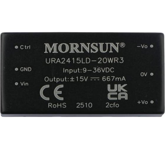 Блок питания MORNSUN URA2415LD-20WR3 на печатную плату, в корпусе 2X1INCH, DC/DC 20 Вт 15 В, -15 В, изолированный, широкий вход, биполярный выход 2183180