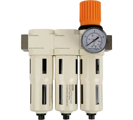 Блок подготовки воздуха 3/8" трехступенчатый с влаго-маслоотделителем, регулятором и манометром WiederKraft WDK-70730FA - это система подготовки воздуха для работы с пневматическим инструментом.