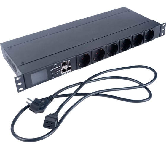 Блок распределения питания Cabeus 1U горизонтальный, входной разъем С20, выходной 8xSchuko розеток, 1 фаза, 16 A, мониторинг/управление, евро-шнур SMART-PDU-C20-8S22-CM