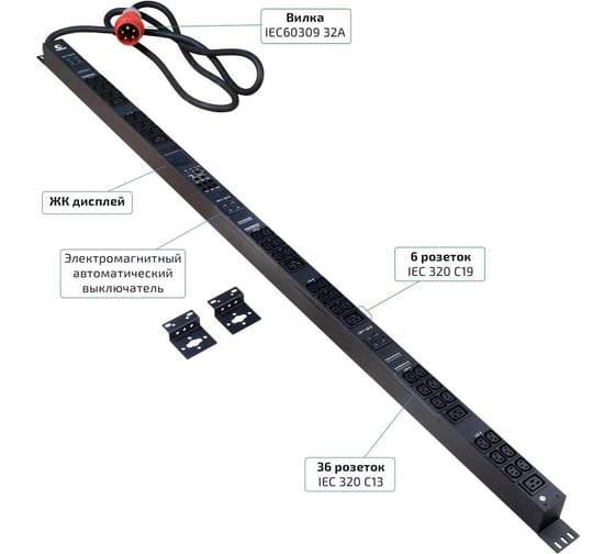 Блок распределения питания Cabeus вертикальный, 36 розеток IEC 320 C13, 6 розеток IEC 320 C19, 3 фазы, 32А, 6х16А автомата защиты, 40 SMART-PDU-32-3P-36C13-6C19-I309-CM