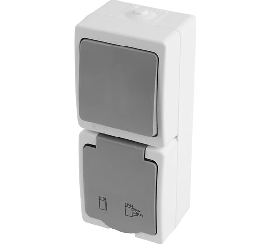 Блок STEKKER розетка 1-местная с/з + выключатель 1-клавишный, PST16-21-54V/10-211-54, белый/серый, 49738
