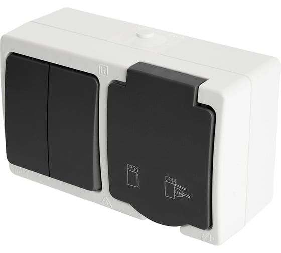 Блок STEKKER: розетка одноместная с заземляющим контактом открытой установки, двухклавишный выключатель 250В, 16А 32761