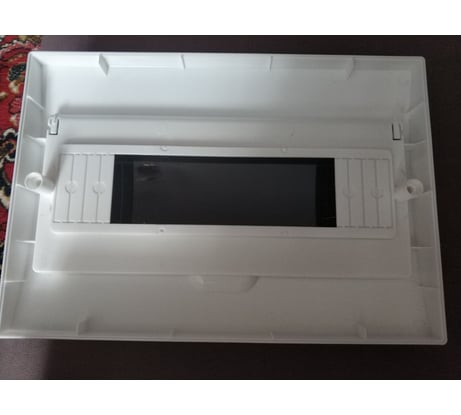 Пластик не пахнет. Окошко скорее серо-голубое, а не коричнево-бронзовое как на фото и чуть менее прозрачная, но маркировку на автоматах прочитать можно даже с некоторого расстояния. Ширина 265мм высота 180мм максимальная глубина с крышкой-окошка 95мм Внутри по углам верхней стороны 2 шинки ~7,5мм x 5мм с дырами ~4,5мм в одной 4 в другой 8 для проводов. Задняя панель глухая, только 2 дырки-ушка горизонтальное и вертикальное для подвеса на стену. Снаружи сверху и снизу по 3 контура для муфт. Верхняя крышка крепится на шурупах, и DIN рейка шириной 210 мм - поэтому впихнуть больше 12 модулей не получится.