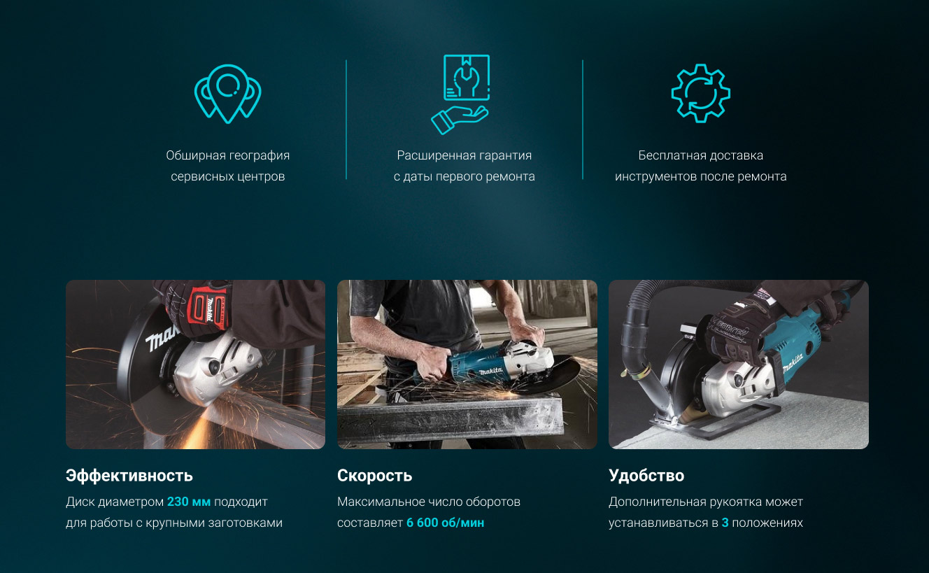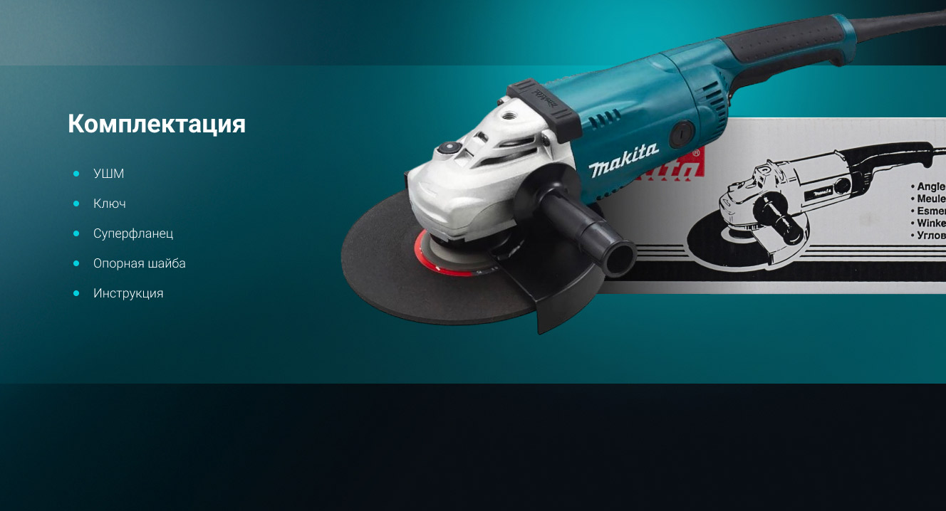 Плавный пуск. Удобная клавиша пуска с удобным же фиксатором. Суперфланец - диск легко откручивается, эффект "самозятягивания" гайки нивелируется этим самым "суперфланцем". Потоки воздуха в системе охлаждения распределяются толково, когда пилишь бетон или камень (много пыли), сдувает пыль с рабочей области, можно разметить линию реза карандашом или фломастером и спокойно работать, всё видно. При работе в тяжелых условиях (пыль, жара) редуктор нагревается градусов до 40-45, рукой чувствуется, что горячий, но не обжигает. Двигатель, при этом, чуть тёплый! После работы инструмент продуваю компрессором. Пыли в эту болгарку набирается мало, то есть, она не оседает внутри инструмента, в отличии от, например, другой фирмы (тоже есть, оттуда выдувается много пыли после работы). Три позиции основной ручки. То, что нет виброручки, думал, будет недостатком (в другой фирмы она есть, понравилось), однако, то ли тут редуктор хорошо выполнен, то ли ещё чего, разницы по ощущениям от работы с виброручкой и без не заметил. Хорошо сбалансирована. Куплена взамен другой фирмы на 230, мощностью 2,3 кВт. Тот работал по резке металла с 2012 года. Но на бетоне и камне шлифмашина другой фирмы быстро надул лапы. Вдобавок, шлифмашина другой фирмы 2,3 кВт оказались заметно более хилыми, чем "макитовские" 2,2 кВт. После шлифмашины другой фирмы руки тряслись как у паралитика дня два, если резать или шлифовать им бетон целый день. С этим инструментом такого нет, резал армированный бетон с гранитным наполнителем. Кому нужен надёжный и мощный инструмент для большого объёма работ по бетону и камню - рекомендую. Если бы планировал резать только металл, купил бы чего дешевле и проще. Надеюсь, прослужит долго. Мой экземпляр сделан в Бельгии (удивило).