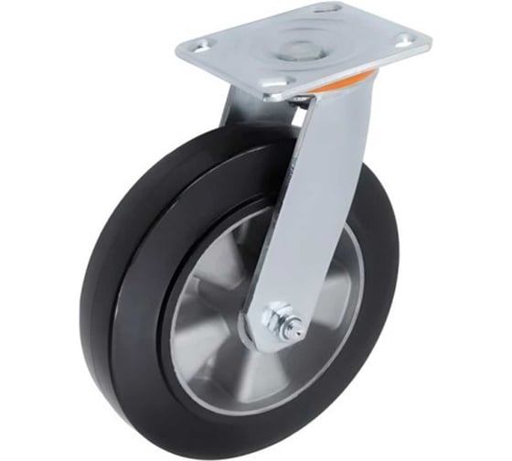 Колесо оснащено алюминиевым ободом, который сочетает в себе прочность и лёгкость конструкции, а черная резиновая шинка обеспечивает мягкий и бесшумный ход, отличное сцепление с поверхностью и защиту от вибраций. Такая комбинация материалов увеличивает срок службы колеса и снижает износ пола при эксплуатации. Поворотный стальной кронштейн позволяет легко маневрировать тележками и платформами, обеспечивая плавное и точное управление.