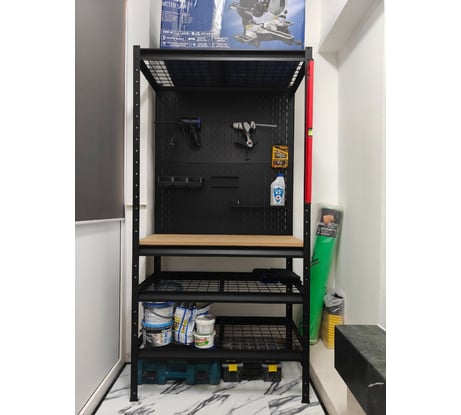 Верстак-стеллаж представляет собой практичное решение для организации рабочего места, сочетающее в себе функциональность верстака и системы хранения инструментов и материалов.