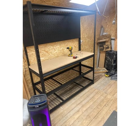 Отличный верстак. Мне пришлось его укоротить по высоте.потолок низкий. Поэтому прикрутил только одну перфопанель, а вторую закрепил рядом на стену. Металл хороший. Расстояние между отверстиями на перфопанели 5 см.