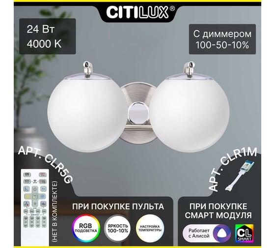 - Одиночный подвес, настольная лампа и настенные бра базово управляются только при помощи пульта или настенного выключателя, однако, вы можете приобрести смарт-модуль Citilux CLR1M, чтобы включить эти светильники в систему умного дома