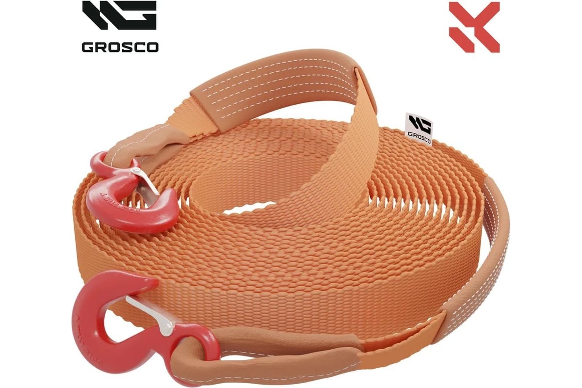 Текстильный буксировочный трос GROSCO. Наиболее популярный вид тросов для буксировки, позволяет вытягивать автомобили, грузовики, лодки, прицепы и другие транспортные средства. Добавьте этот прочный автомобильный ремень в свой аварийный дорожный комплект, чтобы буксировать любые автомобили из трудных ситуаций.