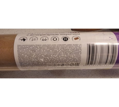 Рулон упакован в пленку, но хотя бы без каких-либо повреждений - даже края не замяты. Жаль, что не в картоне с ножом, пришлось запихивать в свою старую коробку, предназначенную для 8м рулона, но даже в него этот 50м рулон кое-как влез, что дополнительно говорит о малой толщине бумаге. Присутствует силиконовое покрытие. Обычная выпечка отстает от бумаги нормально. Если не очень жирная или сахарная, то листы вполне можно повторно использовать, но я бы оценил лимит - 2-3 раза повторного использования. Произведена в Китае.