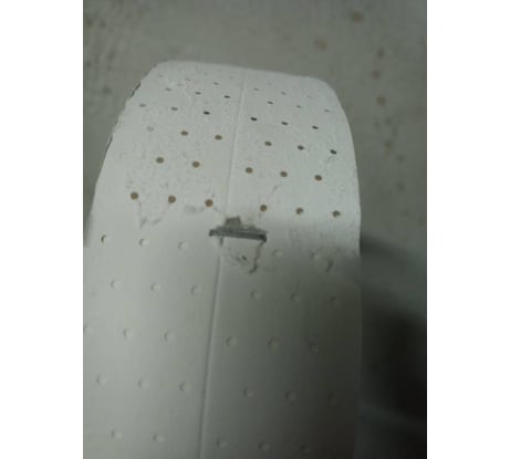 Лента плотная, не размокает. Шпаклёвка продавливается неплохо. Держится. Можно собрать угол. Край закреплён на скобу от степлера, которая глубоко забита. Это и хорошо и плохо.