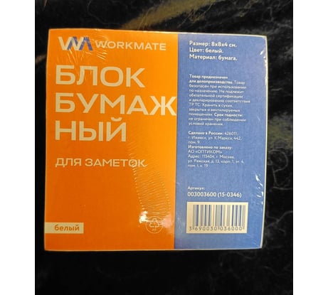 Бумажный блок WORKMATE 80x80x40 мм, белый, офсет, 60 гр, в термопленке, белый 15-0346