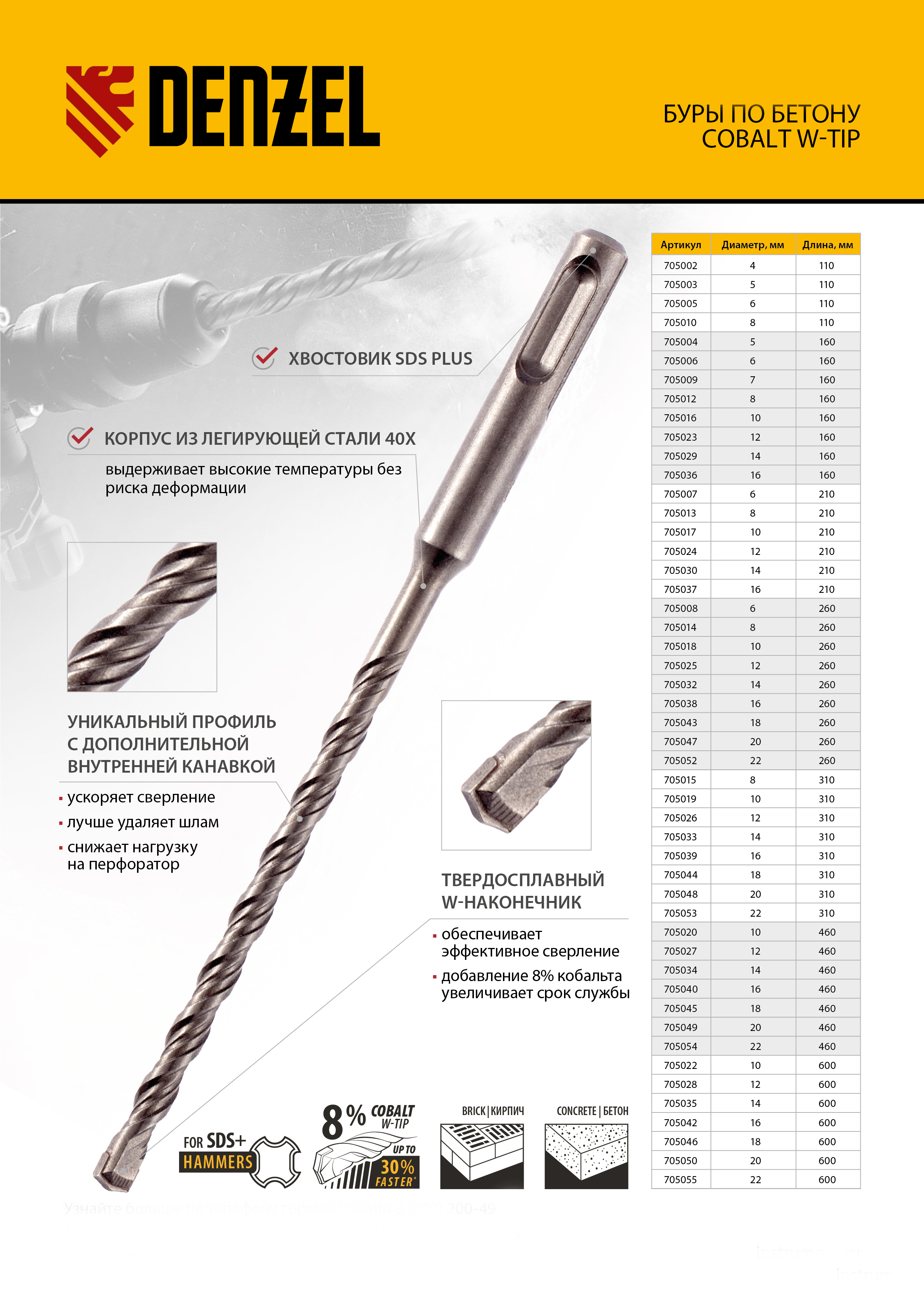 Технические характеристики бура sds-plus по бетону Denzel 705024
