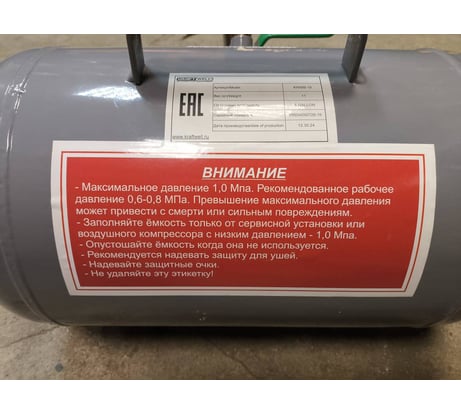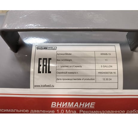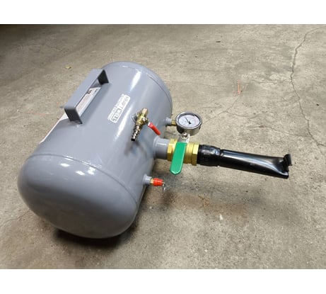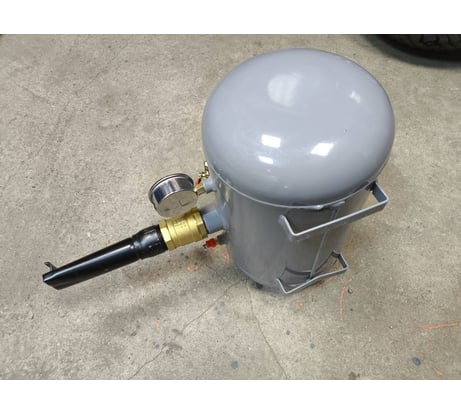 Бустер для взрывной накачки колес KRWB-19 представляет из себя переносную металлическую ёмкость в виде баллона, заполняемого сжатым воздухом до определенного давления, как правило, не превышающего 10 бар. Для контроля давления в баллоне предусмотрен манометр, а для защиты от превышения максимального давления установлен предохранительный клапан. Подача сжатого воздуха к шине осуществляется через патрубок при помощи шарового вентиля или кнопки.