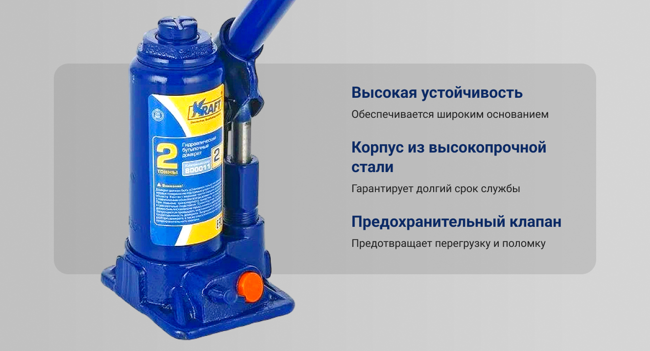 Оборудование оснащено предохранительным клапаном, что делает использование домкрата безопасным и исключает вероятность поломки, при превышении максимальной грузоподъемности.