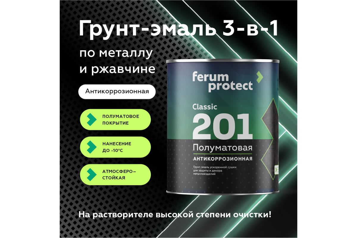 Быстросохнущая грунт-эмаль Ferumprotect 3-в-1 201 Серая ПОЛУМАТОВАЯ 2,7 кг ЗОР00010672 используется при окрашивании поверхностей из чугуна, черной стали и других сплавов, которые находятся под воздействием агрессивной среды.