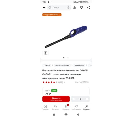 Отзывы о бытовой газовой пьезозажигалке СОКОЛ СК-302L с классическим пламенем, многоразовая, синяя 61-0960