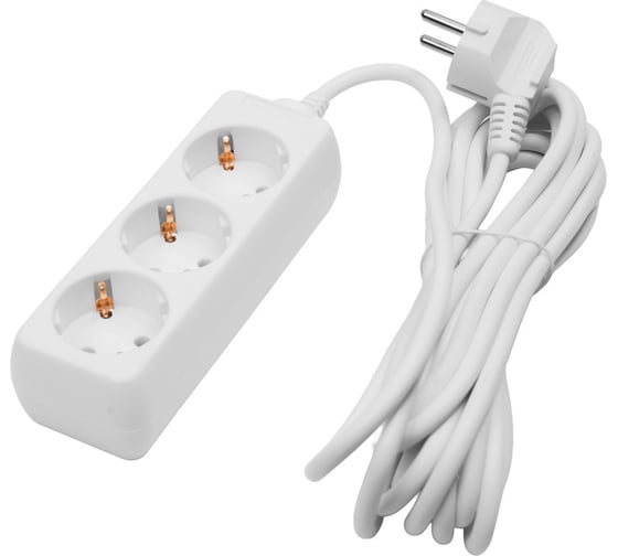 Удлинитель бытовой с заземлением, розетки, шт. - 3, длина провода, м - 5, цвет - белый, провод - ПВС 3х0,75, номинальная сила тока, А - 10, макс. мощность, Вт - 2200