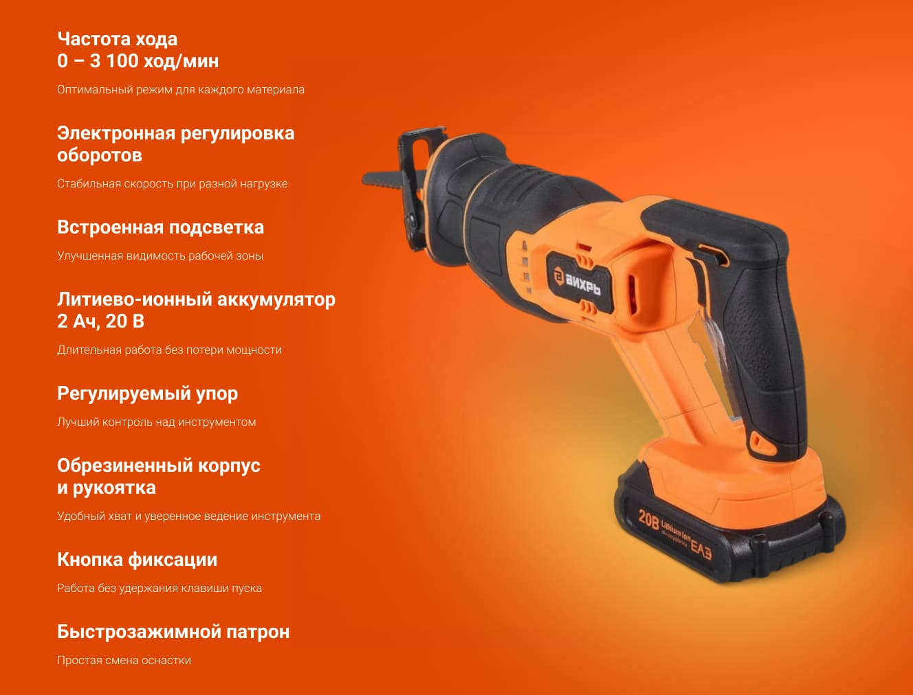 Аккумуляторная сабельная пила АСП-20Li (в комплекте 1 АКБ и ЗУ) Вихрь - это тип электропилы, в котором процесс разрезания (пиления) осуществляется возвратно-поступательными движениями лезвия.