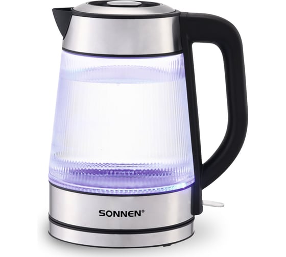 Стильный и надежный чайник SONNEN станет прекрасным дополнением любой кухни. Оригинальный рельефный корпус из термостойкого стекла, приятная синяя подсветка – отличный чайник для атмосферного чаепития!