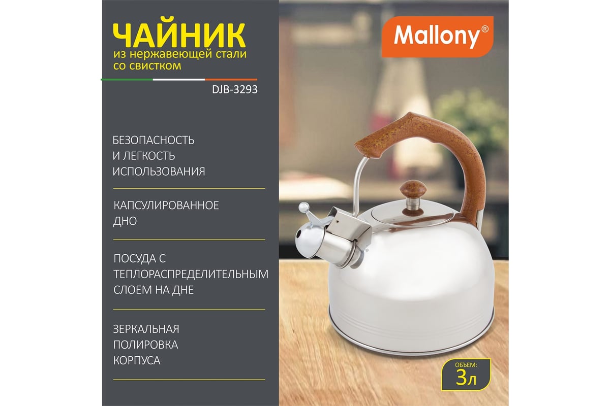 Чайник из нержавеющей стали со свистком Mallony DJB-3293 3 л, капсульное дно 900062 предназначен для кипячения воды.