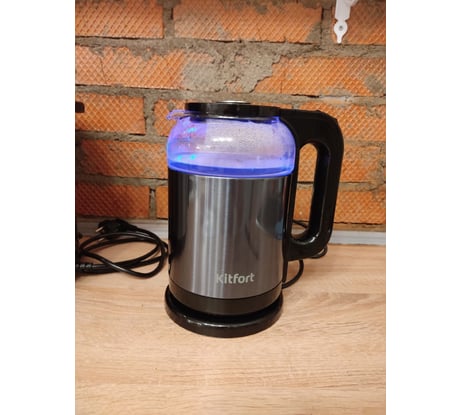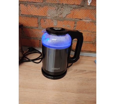 Отличный стильный чайник, хотел именно фирмы Kitfort, потому что нравится подход бренда к клиенту. Крепкая широкая ручка, удобно держать в руке и наливать. Объем 1.8 литра, оптимальный. Имеется подсветка синего цвета, что приятно удивило, ведь об этом не было сказано в описании. При полной заливке воды до максимума кипятит за ~6 минут. В подарок идет прикольный магнитик на холодильник. Покупкой доволен :)