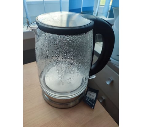 Корпус выполнен из стекла, а крышка и подставка - из сочетания пластмассы и нержавеющей стали. Мерная шкала нанесена на прозрачную часть корпуса. Ручка чайника пластиковая, не нагревается и удобно лежит в руке.