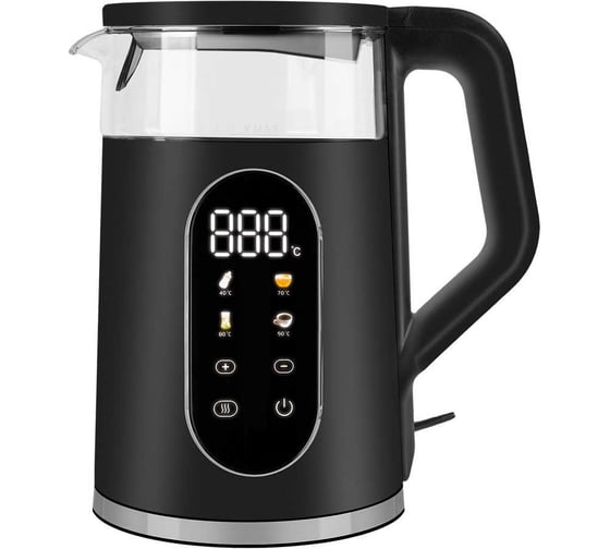 Управление чайником реализовано через сенсорные кнопки, а всю информацию пользователь получает с большого цифрового дисплея. На нём отображается текущая температура и выбранный режим работы. Индикация включения и уровня воды дополнительно повышает удобство использования.