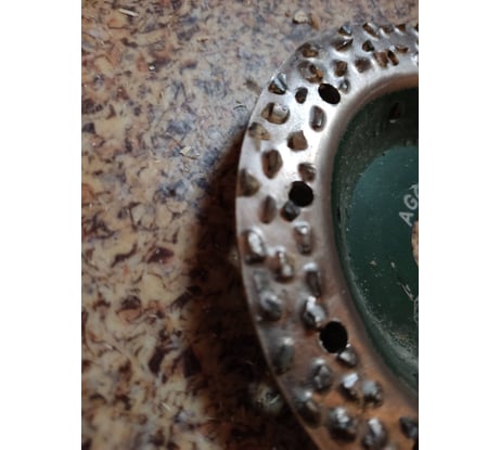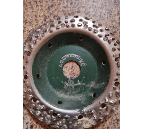 Действительно работает агрессивно - грызет очень интенсивно, опилками/смолой не забивается (за счет того, что зерна крупные и промежутки между ними большие). Однако, именно потому, что зерна крупные (высоко торчат), они легко отрываются: на первом же кв. метре деревянного пола (в основном из лиственницы, фото 3) чашка лишилась 60% зерен (фото 1 и 2), причем работа была без нажима, только под весом самой болгарки. Остальных зерен хватило еще на 3м² (фото 4). В общем, ресурс оказался очень маленький.