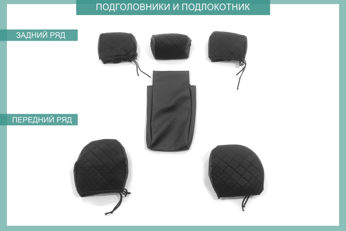Первый ряд: Сиденье переднего кресла левого - 1шт Сиденье переднего кресла правого - 1шт Спинка переднего кресла - 2шт Подголовник переднего кресла - 2шт Второй ряд: Спинка заднего дивана малая - 1шт Спинка заднего дивана большая - 1шт Сиденье заднего дивана - 1шт Подголовник 2-го ряда - 2шт Подголовник 2-го ряда центральный - 1шт Подлокотник 2-го ряда - 1шт Всего элементов - 13шт.