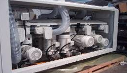 - Конструкция станка предусматривает возможность установки блока дисковых пил на последнем шпинделе. Увеличенная мощность двигателя, специальная текстолитовая вставка на рабочем столе, которая предотвращает заваливание заготовки в процессе обработки.