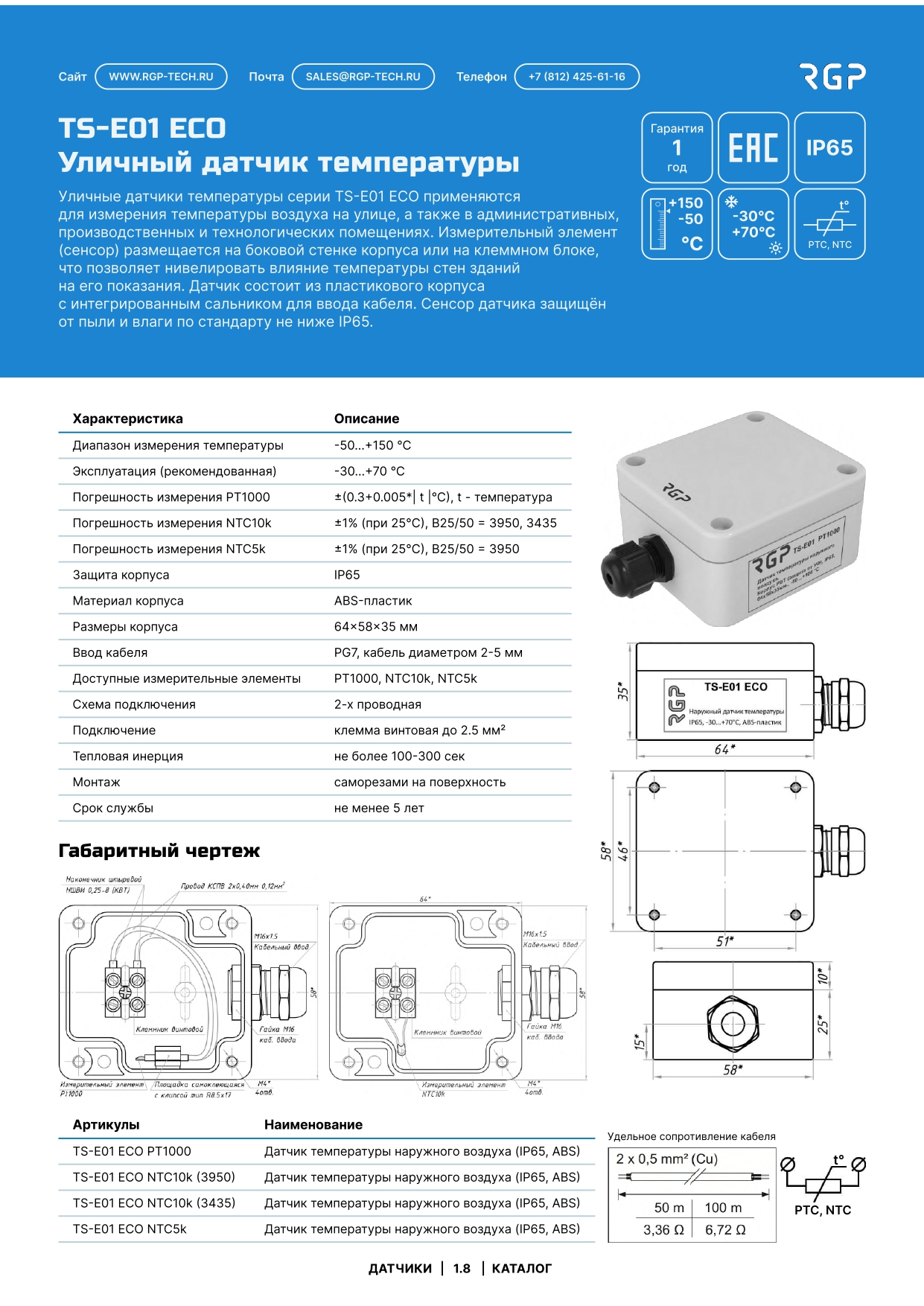 Датчик температуры наружного воздуха TS-E01 ЕСО: выпускается в корпусе из ABS-пластика с кабельным вводом PG7 для ввода кабеля диаметром 2…5 мм и защищен от попадания пыли и влаги по стандарту IP65.
