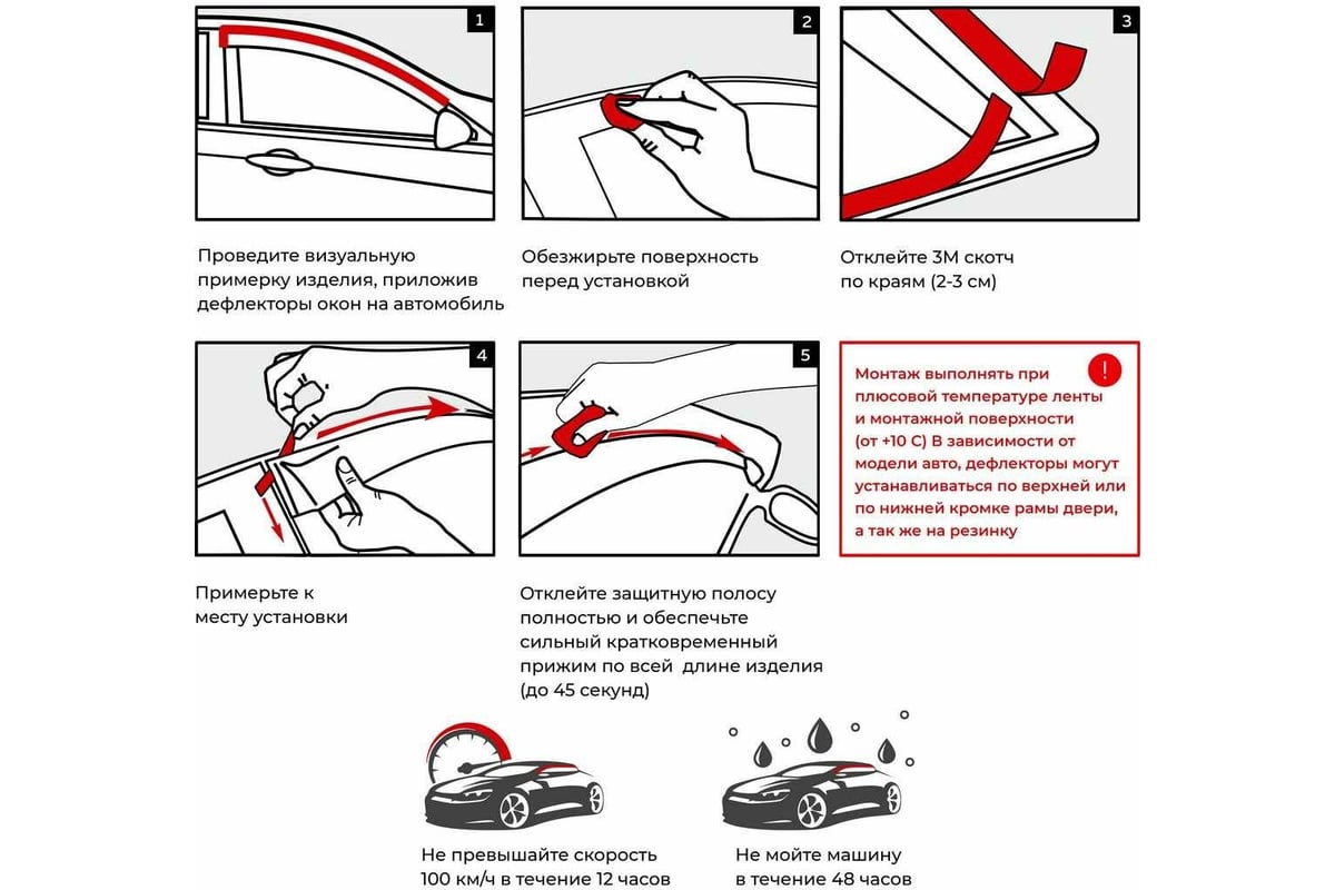 Дефлекторы повторяют все изгибы окон автомобиля, не требуют подгонки при установке. Подходят для использования в любых климатических условиях.