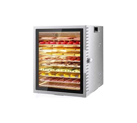 Дегидратор-сушилка настольный с 10 решетками (лотками) размером 290x290мм, электронным управлением, таймером на 24ч имеет двойные стенки, корпус из нержавеющей стали, стеклянную распашную левую дверцу, подсветку.