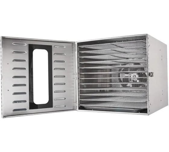 Сушилка для овощей и фруктов электрическая изготовлена полностью из нержавеющей стали AISI 201/304, которая соответствуют всем санитарно-гигиеническим требованиям. Имеет 12 стальных решеток размером 38.2х28.2 см, поддон для сбора крошек. Дверца с окном из закаленного стекла.