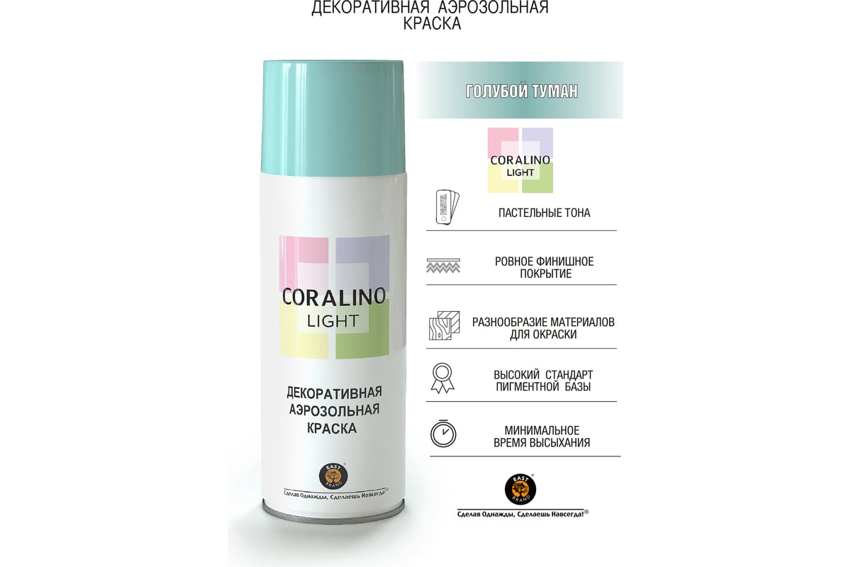 Декоративная аэрозольная краска CORALINO LIGHT Голубой туман CL1001 окрашивает поверхности из дерева, металла, пластика, стекла, камня, бетона, бумаги, картона, гипса, керамики. Быстросохнущая формула обеспечивает гладкое однородное покрытие без подтеков. Предназначена для внутренних и внешних работ.