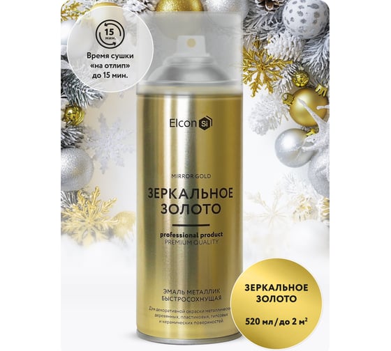 Аэрозольная краска Elcon в баллончике для мебели, для декора, для металла, для пластика, для керамики, для стекла, для гипса, быстросохнущая, акриловая зеркальное золото аэрозоль 520 мл 00-00002992 предназначена для декоративной окраски металлических, деревянных, пластиковых, гипсовых и керамических поверхностей.