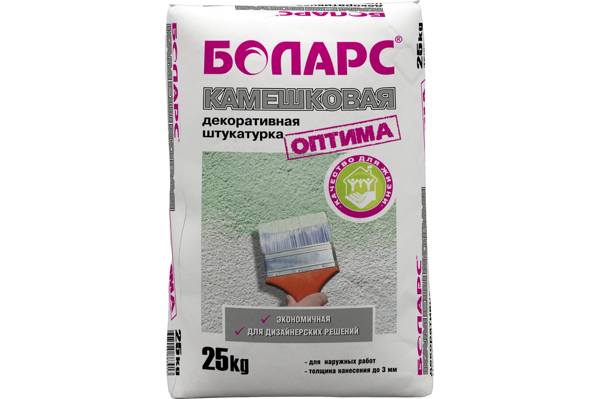 Декоративная штукатурка БОЛАРС Камешковая оптима фракция 2.5 мм, 25 кг 00000006186 предназначена для оштукатуривания стен в качестве финишного слоя при наружной отделке, за исключением цокольной части фасадов зданий.